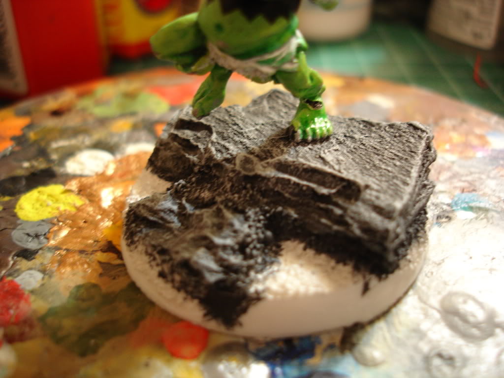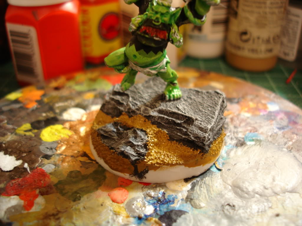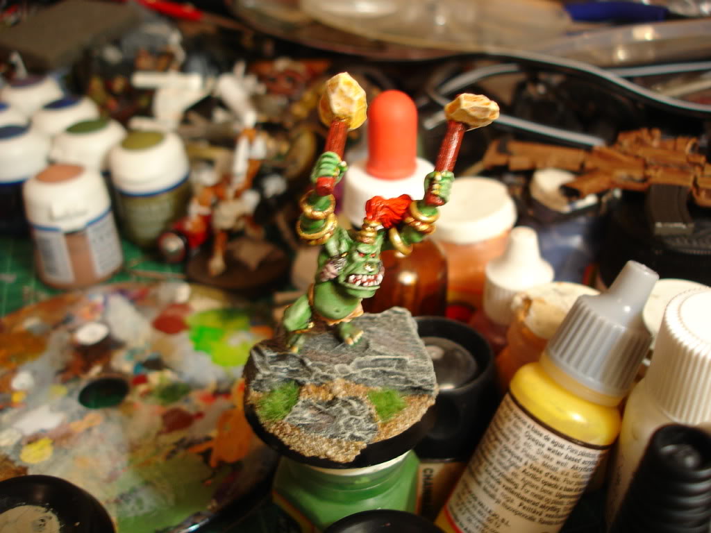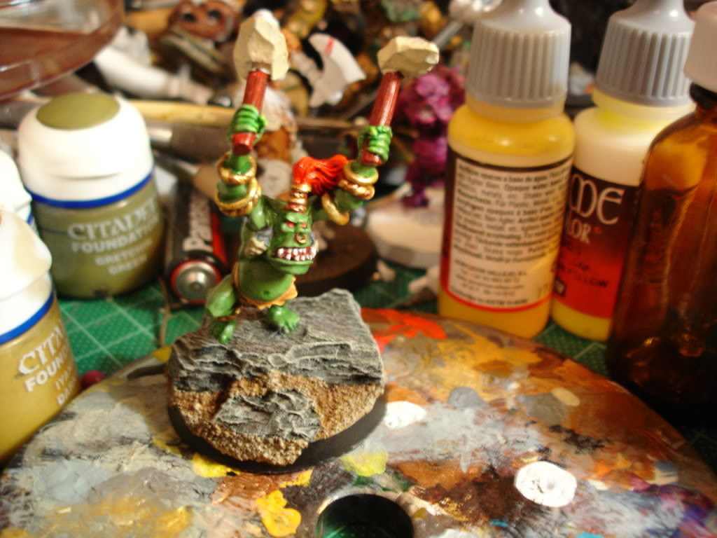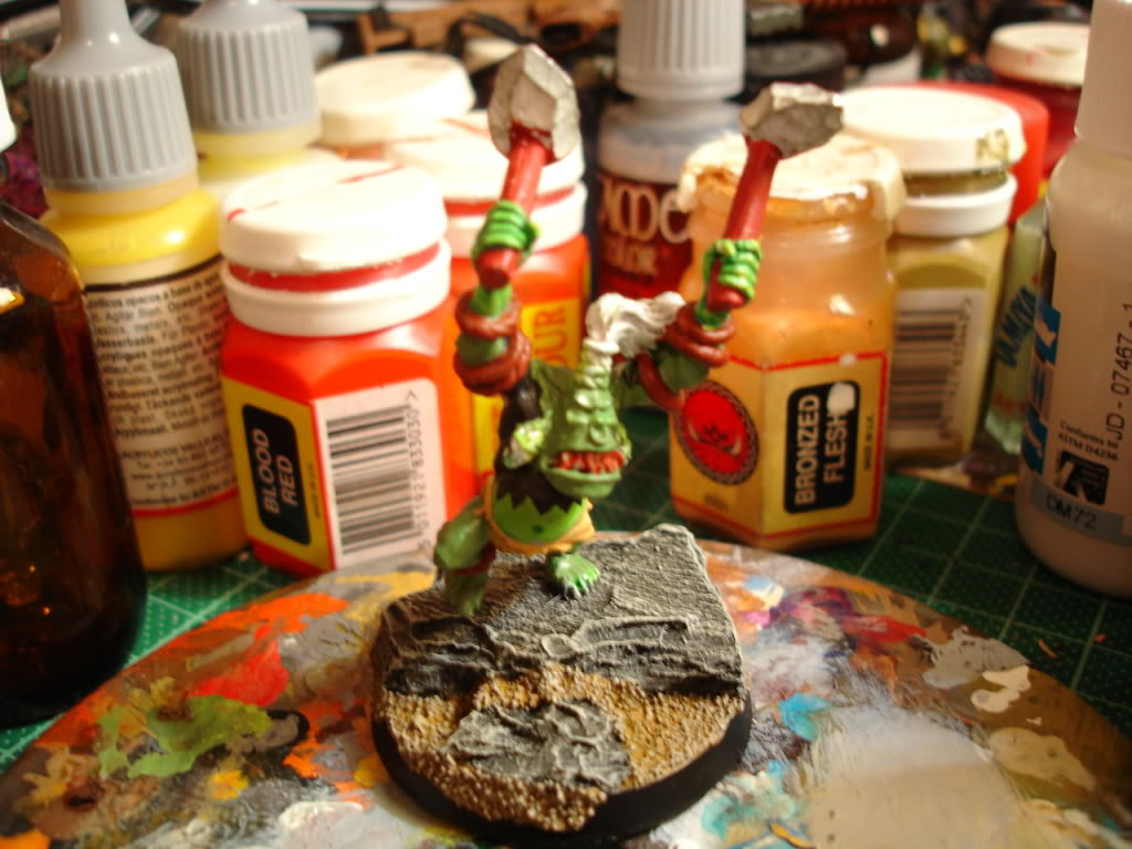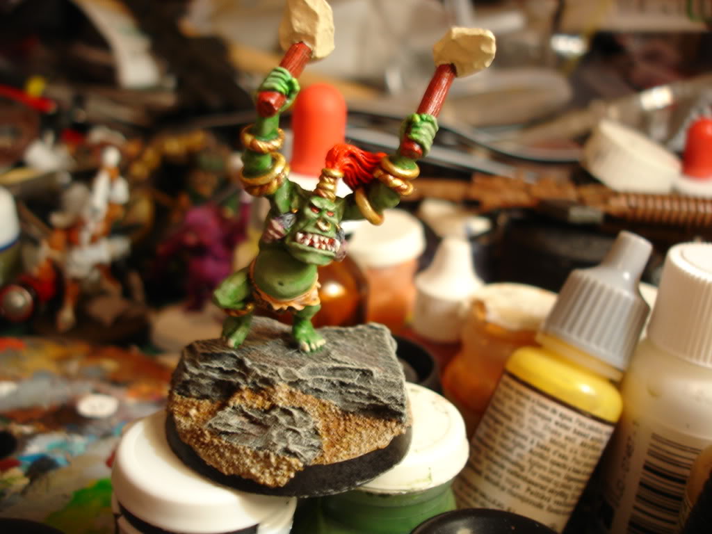 A final bit of shading and highlighting, some static flock to add some colour to the base, and we’re Finished! So that’s the process of painting an orc. Exciting, eh?
