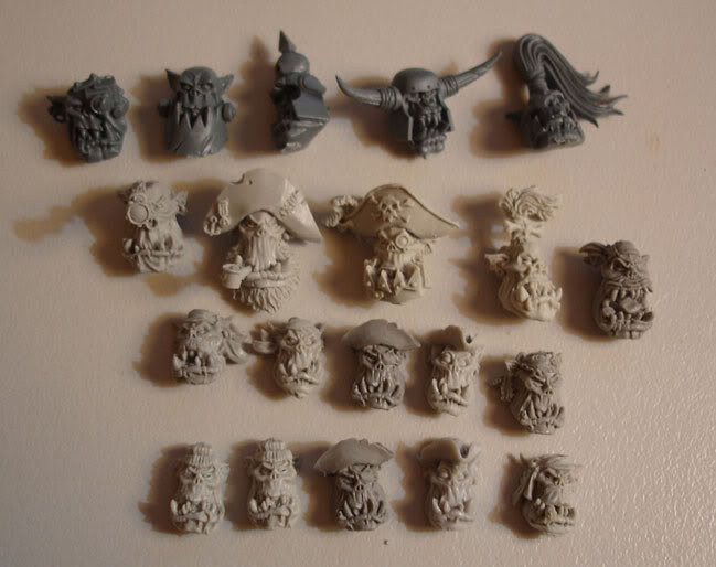 Comparison shot with some Black Reach Orc Nob heads, and also a couple of pics of a couple of the Nob heads blu-tac’ed onto some Black Reach Ork bodies.