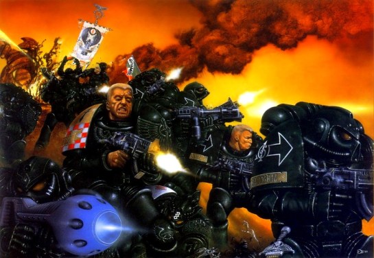 Now if you thought the other two were big, these will really impress. These ones are edging towards being ludicrously big, but despite this, I really like them. The sculpting and design on them are really well done and a bit different. They still look a little Horus-Heresy-retro, but perhaps like something that was newer then. They look like something that would fit in with the era of this classic Paul Bonner Dark Angels painting (used as a WD cover back in the day). Not-quite Rogue Trader, Not quite modern era. Around the days of Adeptus Titanicus and Space Marine. Note the marine firing! If you look carefully, you can see how he’d probably like you to say hello to his little friend..