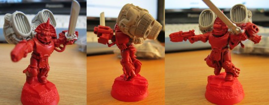 Here’s the pack being modelled by a marine I’ve been working on for a mate. He won’t have a jump pack in his final form, but since his wasn’t glued on, I thought he’d work fine as a Jump Pack model. As you can see, this Jump Pack is a pretty big piece of work.