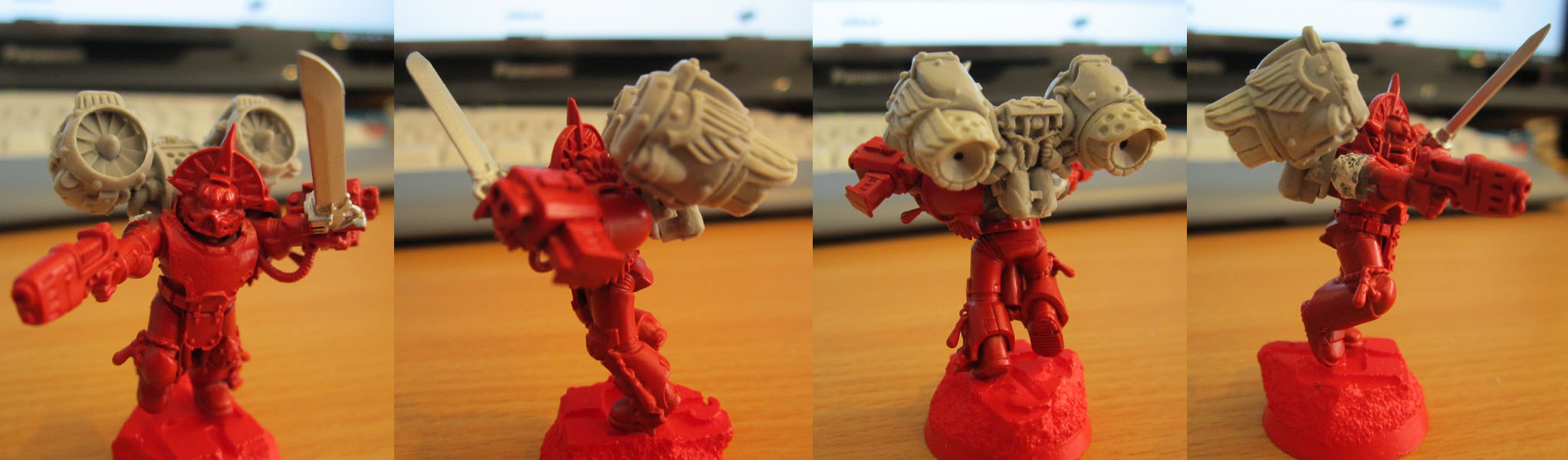 Here’s the pack being modelled by a marine I’ve been working on for a mate. He won’t have a jump pack in his final form, but since his wasn’t glued on, I thought he’d work fine as a Jump Pack model. As you can see, this Jump Pack is a pretty big piece of work.
