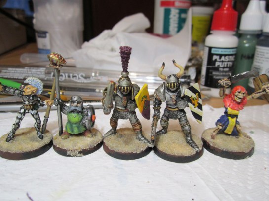 A few more figures getting the rebasing/updating treatment. The wardancer will pretty much be left alone. The dwarf will get a bit of a touch up (even though there’s something about him I don’t really like). I’ll probably brighten up the knights’ armour, add another layer of highlights to the plume, repaint the horns, and I also need to figure out what to do with their shields – since I’m unhappy with both. Either repainting the devices (Bat, Snake) or something more drastic. Basically, I’ve never truly been happy with either of these figures, so I need to do something to fix them this time. The skeleton.. well, yeah. Clearly he needs a complete clothing overhaul.