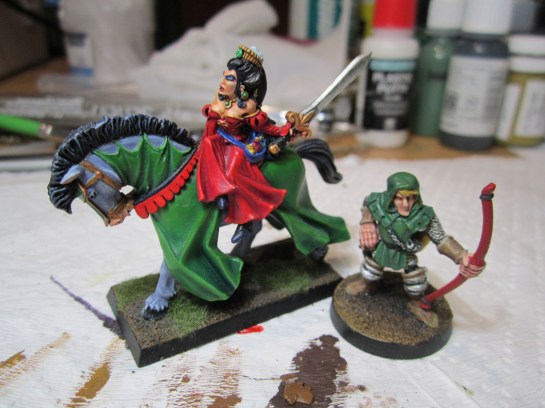 The foot figure is an old Citadel ranger, which I picked up around the time of WHFB3, twenty-odd years ago. I started painting him only last year, in a scheme that is somewhat a homage to the paint he had in a very old issue of White Dwarf. The red bow is a nod to GW’s “red period”, though I may yet decide to go over it with a more neutral brown before I complete it. He’s probably only got an hour or so worth of work left on him now, but I feel that I need to be over this cold in order to put in the last bit of work at a standard I’ll be satisfied with. The Brettonian lady must be at least 5 years old? Certainly the majority of the paint on her was done in that time period. When I found her, I again noted that she probably only has an hour or less of work to be completed. I considered doing some freehand on the horse’s caparison, but my wife (who the figure is for) likes the figure as it is, and for my part, I’m not entirely sure which green I used on it… again though – I need to get over this damned colds before I can do so.