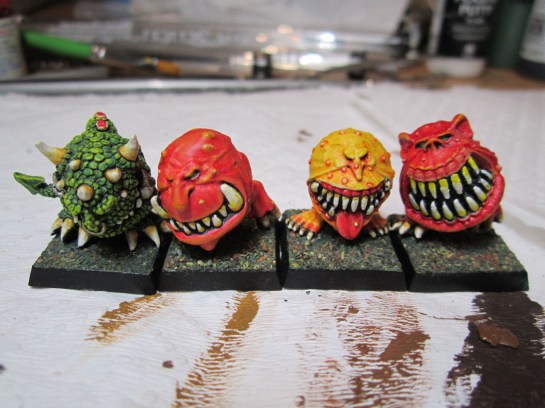(2017 Update – I finally finished most (all?) of these squigs and based them on brown-dirt 25mm rounds – but apparently never photographed them. Now that I’m resurrecting my 40k armies, I need to decide whether to rebase them again onto desert bases like my 40k Orks, and potentially even 32mm bases. Of course my WHFB (KoW) Squig Herders have brown-dirt bases. I might need to come up with some kind of creative solution there…)