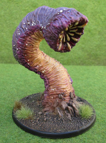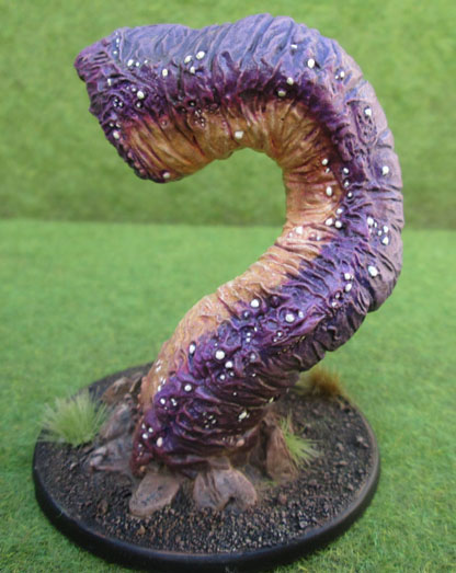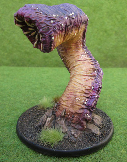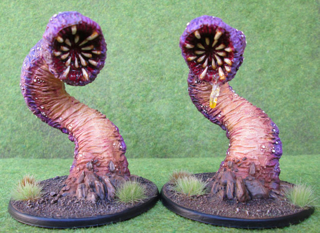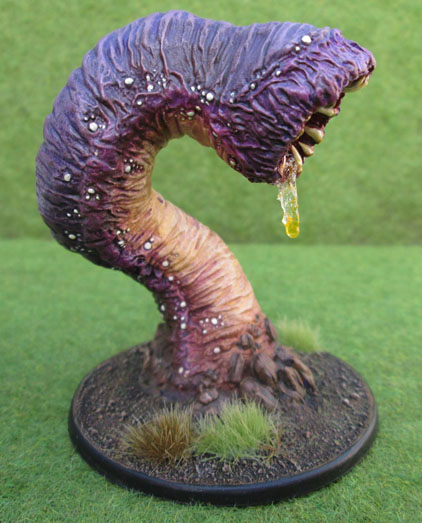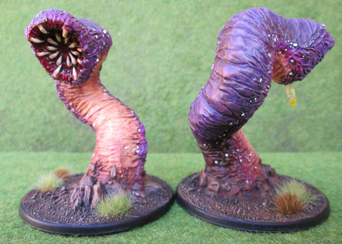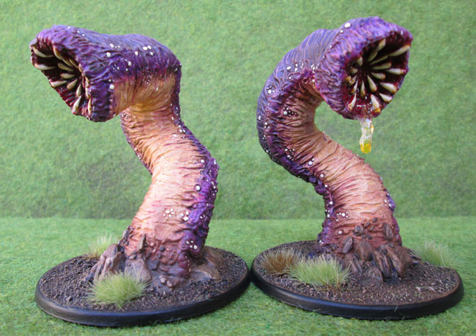 These suckers took awhile to get going, but once I actually sat down to make myself paint them they were quite an enjoyable experience. Originally they were all-purple, then I looked up the D&D colouration, which said they had yellow bellies/undersides, which I thought would look far too cartoony, but it kept bothering me. A day or two later I came back to them and used some sand and ochre shared for the “yellow” to make them look much more like natural colouration, and it worked for me. I used some pinky-purple for the transition ridge between the ochre and the main dark bluish-purple for the main body. One of the things I enjoyed most was the fact that since these are cheap Bones models, I allowed myself to play with them a lot more. I used drybrushing, blending, a purple oil paint wash at one stage, the aforementioned realistic water products, and a few weathering powders in the end. Basically a lot of experimentation and “play”, and I think they turned out pretty successful in the end!