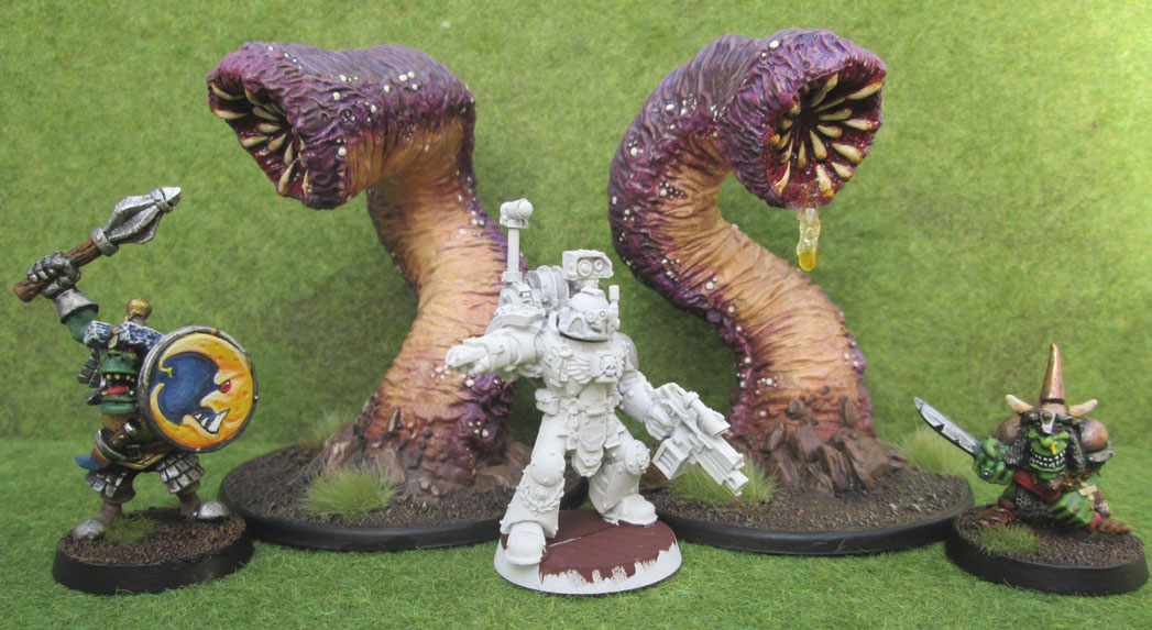 Finally a scale shot. A couple of fantasy figures, and a ubiquitous Space Marine for scale. These are some decent sized models!