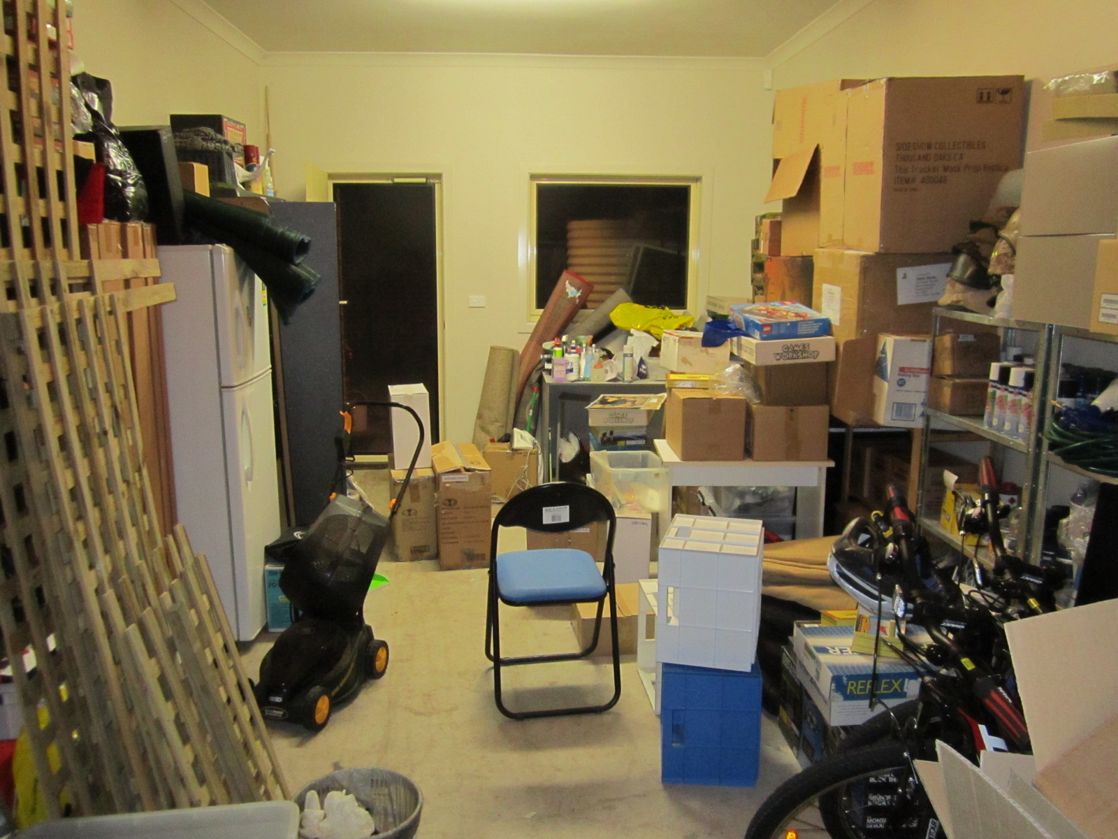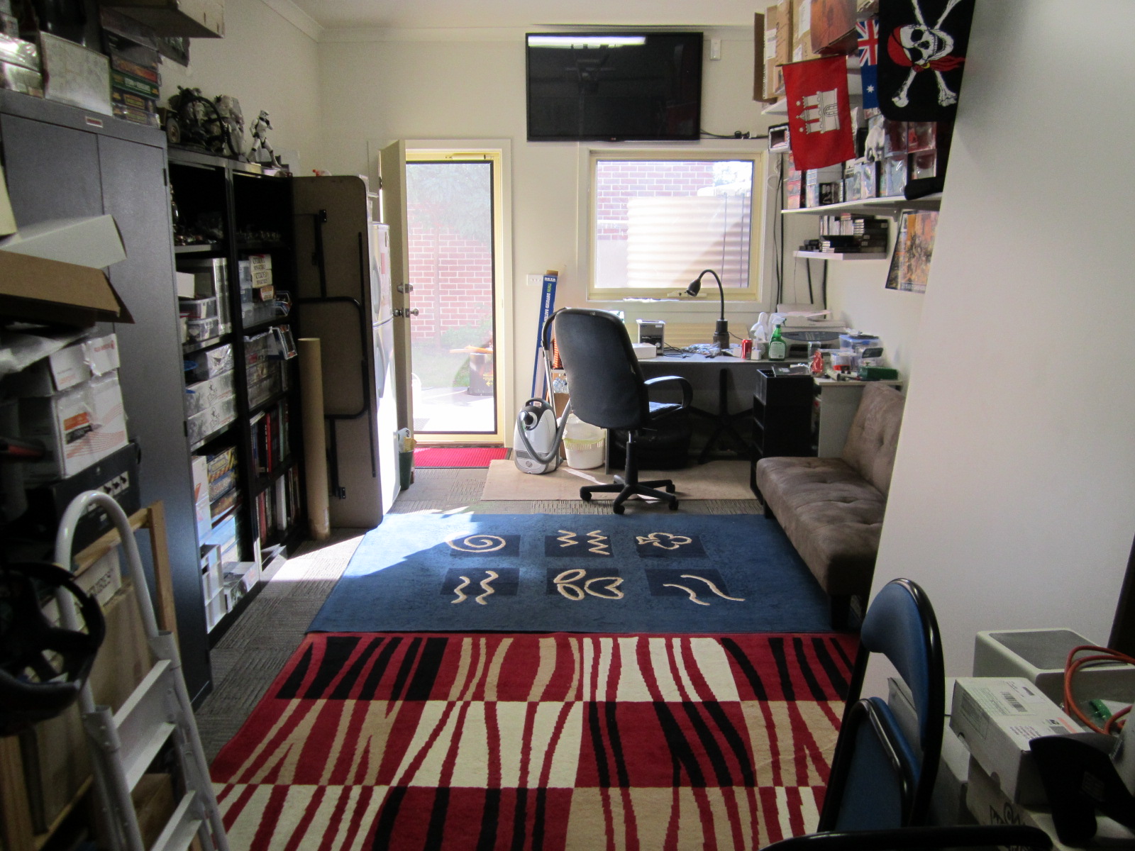 One of our old computer desks is my new workbench out here. I’ve got the ultrasonic cleaner out to strip some figures, who are right now soaking in Simple Green. Need to pick up some cheap lamps later today to use for my light box, so I can take some better quality mini pics from here on out. I probably need to get an A1 sized cutting mat as well. The idea is that I’ll do things like dremelling and scenery building and paint stripping resin moulding and casting and things on the “large and heavy” (and toxic) side of the hobby out here, while the more delicate and arty stuff happens inside. Big box there for the recyclers. We have a fortnightly pickup. We filled our recycling bin and those of our close neighbours up, and three days later our recycling bin was totally filled up again. Looks like we’ll be doing the same again with our neighbours’ help once more when they come again. It’s been a pretty full-on cleaning operation. My old printer also now lives out here as a photocopier (if not for the driver incompatibility we’d have kept it inside – one of the best random late-night purchases we ever made. Going out to buy some blinds this afternoon for the window.