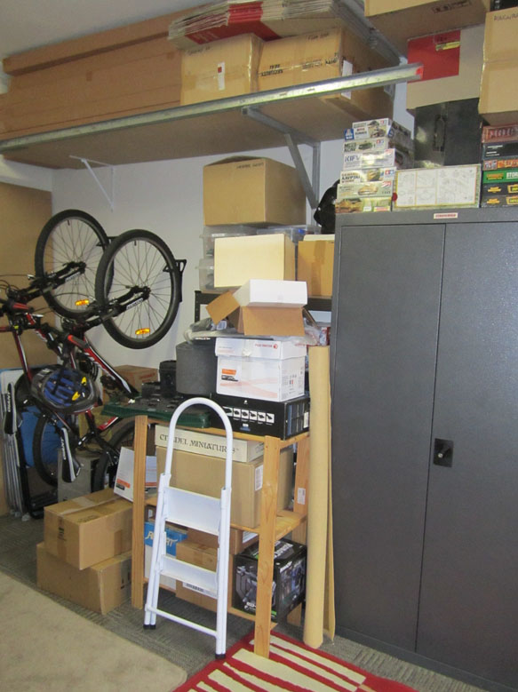 Finally got the bike mounts installed and got them out of the way – giving us much more floor space. Likewise with the high shelving that I finally got finished which gets those detolf boxes out of the way – even more floorspace freed up. Continuing on that theme, the cheap pine shelf will be disposed of. The boxes that fill it are all basically empty. Just being kept for now to rebox stuff that comes out of storage inside much larger boxes after culling. There’s a set of shelves with Rackham prepaint models behind it.