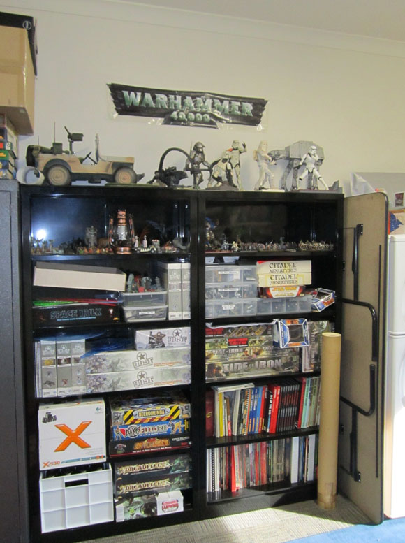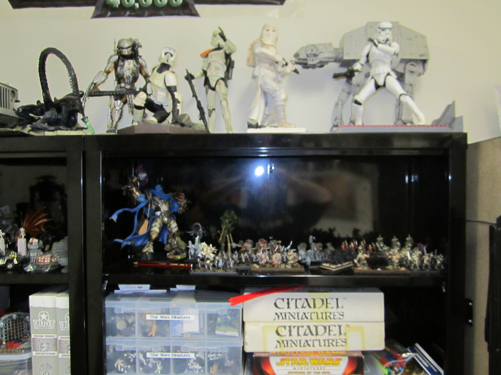 And yes, I finally found a place to display some of my Star Wars Kotobukiya statues. They share the space with the Star Wars miniatures AT-AT. It was quite a decent game, and even as a longtime painter and miniatures collector, having a game with prepaints is no bad thing. While it’s a shame that the game was discontinued, I picked up the VAST majority of my collection once the game had gone into liquidation. I was lucky enough to pick up most of the rules (that Sith box is filled with maps and rulebooks) so I guess it worked out pretty well for me in the end. Other than that, it’s the partially-painted KoW Ogre army who have featured in these pages before, sharing space with the partially-painted Elves, the blu-taced Basileans/Lions, some trees and a Dranei Paladin from World of Warcraft.