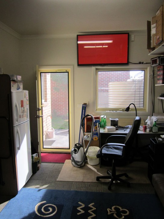 The “atmosphere” is supplied by a 50″ 1080p LG plasma. I actually planned to get a much smaller TV (30-40″ or so) but then I found this particular plasma model had been marked down to less than the 40″ LCDs. So I did the only thing I could do and bought it, and rejigged the entire original wall-mount plan. The green is one of the burn-in slides that are still cycling through. Added another floating shelf, picked up a new, cheap Blu-Ray player and put it in the bedroom, brought the old one down here, added a WDTV Live box and a bunch of appropriate DVDs and Bob’s your uncle. I know it’s right next to the window, but the tv is padlocked to the wall mount, the alarm unit has been moved to right there, the “flyscreen” is actually security mesh that will apparently break your hand if you try to punch through it (I’ve declined to try it out myself) – we got every window covered in it before we moved in – much nicer than shutters.