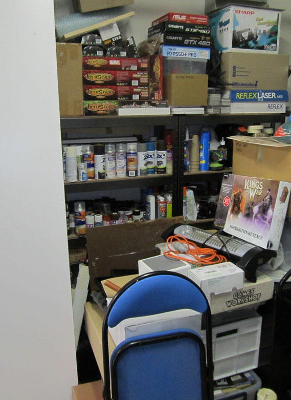 Finally, the final corner of this long-winded panorama. Some art supplies (Ink, PVA glue, etc), latex and resin for moulding that I never quite figured out to any decent skill level, spray paints for modelling, a desk that needs to be disposed of. The remaining junk boxes of the moment that still need to be sorted through, and more scenery and things to make even more scenery with. And a bunch of HeroScape stuff.