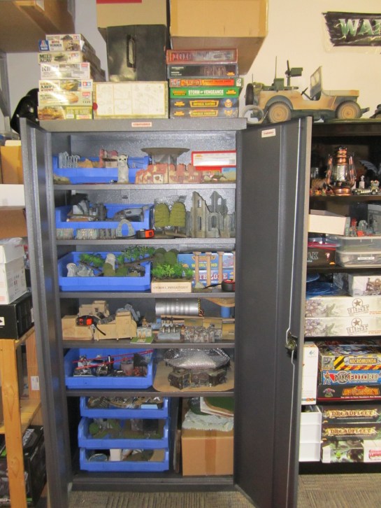 Not the best photo, I guess. But you can see the shelves we put up earlier in the year. The lower level is filled with models and such while the upper contains empty boxes and some more random things that aren’t too heavy. The big white board is the games table, in storage mode. The white cabinet behind it is a cheap pantry cupboard that we bought to use in our previous shitty rental that had no clean storage space for the kitchen. Now it holds hills and unsorted scenery objects.