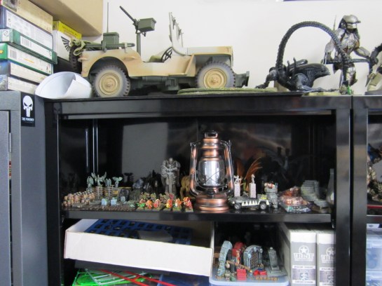 On the neighbouring shelf there’s a bunch of scenery kits that need to be built (some really old now – from the Necromunda era of plastic bulkheads and card). A 1:6 scale 21C Jeep that needs me to find some troops to crew it, and a duo of the Kotobukiya Alien and Predator from AvP. Nice statues, bad film. Top shelf mostly contains resin and metal scenery bits, as well as oversized models that I’ve gotten assembled/primed from eBay – DE dragon, a griffon, and a couple of other things. The LED Lantern was bought on a lark, but I’ve actually found it useful, and should I ever play Cthulhu again it’ll be making an appearance. The lower shelf has a bunch of resin and metal scenery – which like the Fleshhounds just above them were planned for my next set of blog photos about a month ago. So I’ll hopefully get those pics taken in the next week since much of the other work that was stopping me has finally been done.