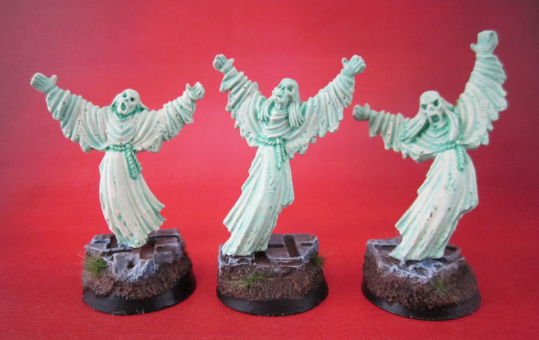From the last post where I talked about the paint process, I simply painted the bases (base, drybrush, wash, weathering powders) and added a thinned down Citadel Sybarite Green paint wash to the eyes, nostrils, mouths, and around the belts and necks/hair of the individual ghosts to emphasis those parts slightly. And of course, a nice matt varnish to finish them off. – And yes, that is a spot of weathering powder on that front guy in the photo. Sorted now!