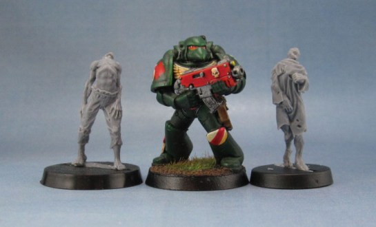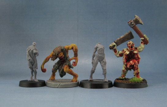 A lot of people interested in this genre have Zombicide these days, so here’s a couple of Guillotine Games/CMoN’s Zombicide figures. Despite the Zombicide models being overall a smidgen taller. and the RBG ones nominally being “fantasy” models, they’re still generic enough to fit in with “moderns” like the Zombicide figures, and are close enough in height and proportion to work alongside the board game’s figures, Just paint them as though they’re wearing torn jeans and hospital gowns.