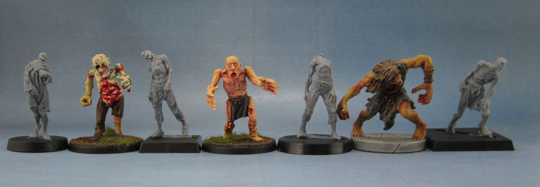 A lot of people interested in this genre have Zombicide these days, so here’s a couple of Guillotine Games/CMoN’s Zombicide figures. Despite the Zombicide models being overall a smidgen taller. and the RBG ones nominally being “fantasy” models, they’re still generic enough to fit in with “moderns” like the Zombicide figures, and are close enough in height and proportion to work alongside the board game’s figures, Just paint them as though they’re wearing torn jeans and hospital gowns.