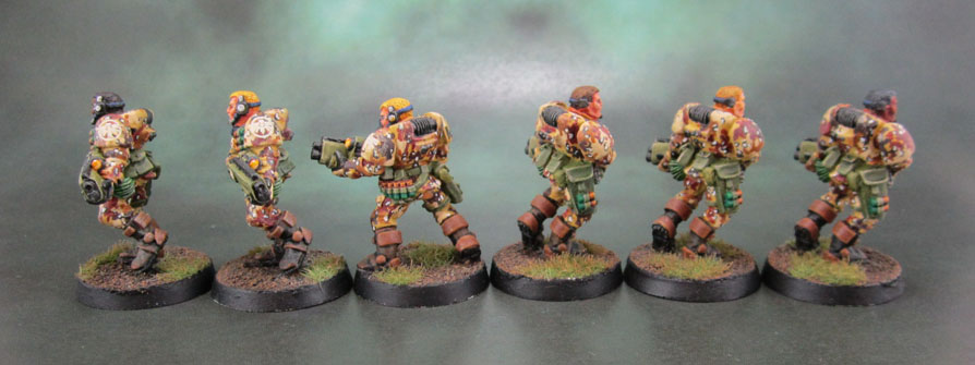Eagle-eyed viewers might notice that these guys aren’t actually painted much like the typical Space Marine or Dark Angels Scouts. Space Marine Scouts’ of whichever chapter tend to have their armoured bits painted like their Chapter’s armour, and the soft “cloth” bits painted in a beige/off-white. All the better to scout with, obviously.