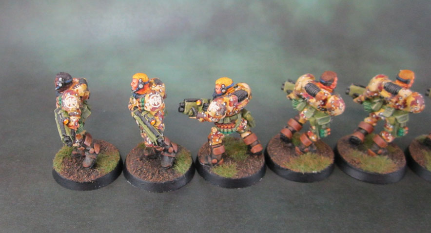 If you browse the Stuff of Legends page for these figures, you’ll notice that no actual bolter-armed model exists in the line. This is why I’ve got a squad armed with shotguns. With no bolter-armed models available, these guys could be (and were) alternately armed with Bolters or Shotguns, as appropriate to the game being played. The “Sergeant” model came later. I think he was released alongside the bolter-armed model a few years later from the initial models. I believe I acquired him later on, but painted the whole gang at once anyway.