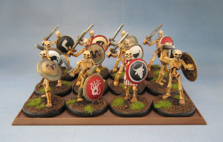 As part of the Mythic Greek force, the (two, probably) units I’ll be making of these guys are going to be referred to as The Hydra’s Teeth. Apparently they should be more correctly referred to as Dragon’s Teeth, but to me “dragon’s teeth” mean tank traps, and I’ve got more than a soft spot for Ray Harryhausen’s seminal animation work of decades gone by. Since the 2 packs of 5 Foundry figures come to have 6 figures with blade, and 4 with spear out of the 10, I’ve split them for Kings of War purposes. I’ve combined the 6 blade figures with the 6 Bones skeleton figures that I finished off a couple of weeks ago to make a KoW Regiment of 12 (20).