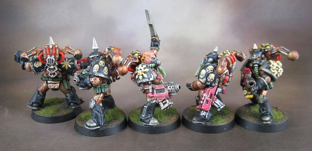 This combat squad of 5 is all I managed to finish. I went copper/black with metal and some hazard stripes. This was years before I decided to build an Iron Warriors force (that I also need to get back to!) but the stripes will integrate the two of them nicely. The Plan (which never got finished) was for the second squad of these guys to have a very similar scheme, but with metallic green replacing the copper.