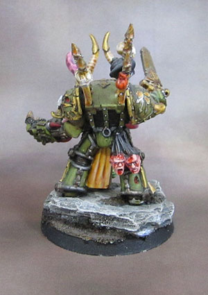 First up we have one of the Two Nurgle Lords in Terminator Armour. Both of these figures were shown in the very early days of this blog about 5 years ago – but as with several other models, new photos and a new context. This guy is a Terminator Champion of Nurgle. Converted for me by my mate Dave who had a good supply of figures and was willing to cut them up (I was unwilling to cut up my own metal models after a certain point in time.) Simple enough, it’s a Chaos Terminator base, Jes Goodwin Chaos Champion head, terminator combi-weapon and left shoulder with a Abaddon Lightning claw, with beckoning fingers to finish. I can’t remember if Dave put the tentacles on it or if I added them myself later on.