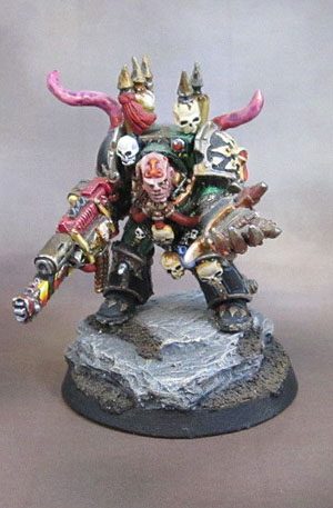 Another Terminator Champion of Nurgle. I think Dave started this guy but I was unsatisfied with the result so extensively reworked it myself. Abaddon body, Chaos Warrior right arm with the original Chaos Terminator Power/Daemon sword on the end of it. I’m pretty sure I swapped out the original left arm for the GorkaMorka-era Ork Bioniks Claw and swapped in the plastic Chaos Champion head. I also drilled out the various tri-abcesses in the armour, added the bloated torso with putty over the top of some plastic Zombie intestines, added the dismembered heads, sculpted the simple hooves and added the tentacles.