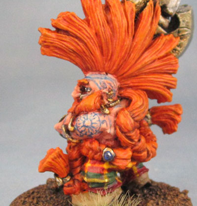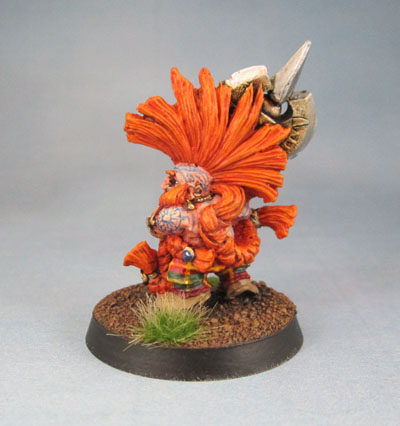Much like most of his fellows, I was never fond of this model, as his hair is… ridiculous. A little less ridiculous that most of the Giant Slayers, I guess – as a tall, thin-crested mohawk like this one could exist much more easily than the multi-lane models sported by the Giant Slayers. I’m okay with his tartan pants, but in retrospect, I should have gone with blue, not red as there’s not the colour differentiation that I would have liked. Even allowing for the fact that they’re a little more defined in person. Ah well, I ain’t repainting him!