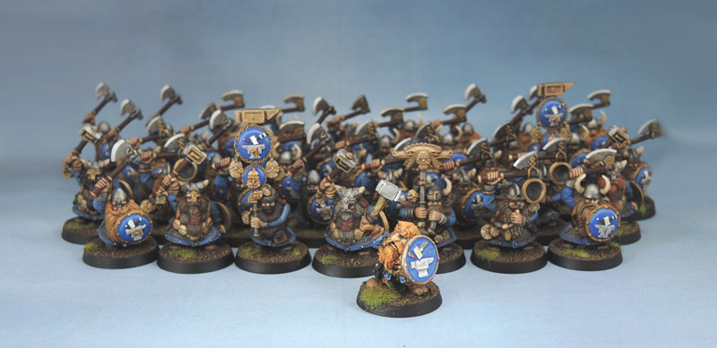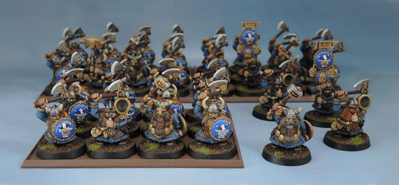 If I were painting these models with no “history”, I’d probably have simply painted the Hammer-and-Anvil motif a nice bronze, much like the Dwarf-Mask bling on the Standard bearers. The thing is, when I started to paint the models, I realised that the same design was much older, and is featured on the (Marauder Miniatures) Dwarf Shields that one of my old, Oldhammer Norse dwarves has (and I have a few of these shields left to break out). Since I wanted the new to fit in with the old, being from the same clan(s), I wanted to make sure that they matched. Which meant going from a simple paint/wash/drybrush scheme to one that needed 10 different colours/applications. While keeping it simple. When doing it to almost 40 models, that takes time. Bleugh.