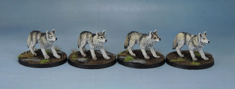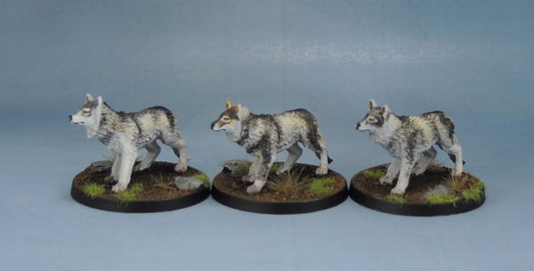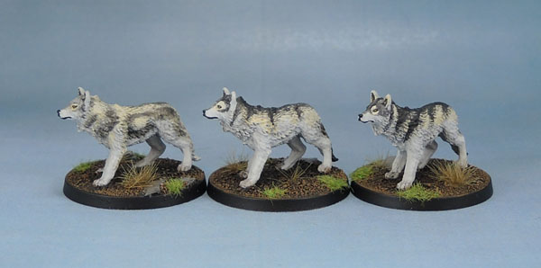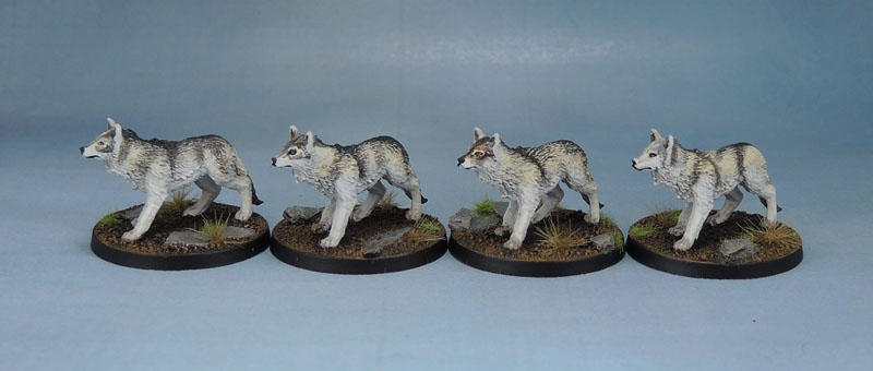 I initially primed them with Tamiya Grey Surface Primer and no real plan, then came inside to google some wolf images. On doing so, I decided that they would look good with a lot of white involved, and so re-primed them from each side with Tamiya White Surface Primer while leaving them a little darker with the grey down the back.