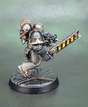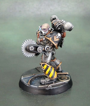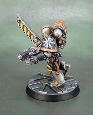 The circular saw arm comes from the same (Not-Orks) “Org” from that game I still can’t recall the name of, while the right shoulder is a metal one. His head is an Iron Warriors head with lots of cybernetic implants. The rest of him comes from the plastic kits of the day. As with many of the other models, I kept a link to the Legion with the IV added to his left shoulderpad.