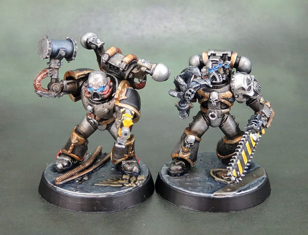 Today we have the next pair of my “Legacy” Iron Warriors – what these two have in common is the use of Necromunda Pit Slave arms as Close Combat Cybernetics. Much like their fellow reaching for the sky with his chainsaw arm in the very first set of finished close combat Iron Warriors.