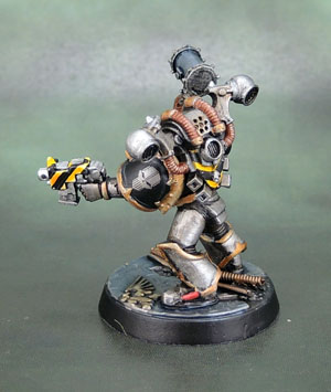 The IW badge is on his left shoulder this time. I’ve added some hazard stripes to his backpack. I just find I need to be a little bit careful with those on models’ backpacks as I don’t want them to look like Bees or Wasps! Surely that’s a different Space Marine Chapter!