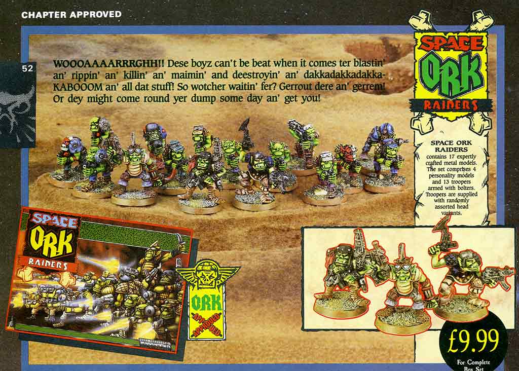 The interesting thing (possibly the only interesting thing) about these sculpts is that they share a “base” model with the troopers from the RTB02 Space Ork Raiders boxed set, which was the first ever Space Ork boxed set for 40k, also released in 1988.
