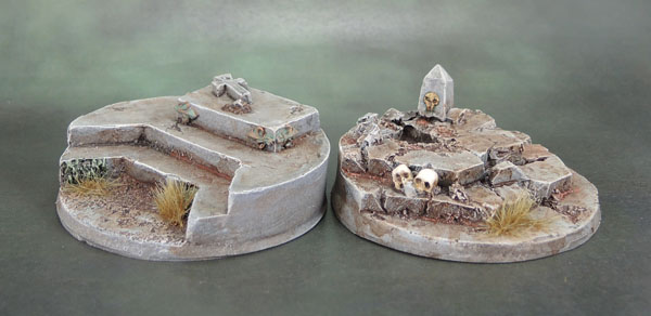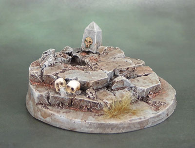Another couple of small scenic bits given to me some time ago that I have no idea of the origin of – these two resin pieces seem to be part of the same series, as they’re almost inverse of one another. Given their 60mm diameter, they’re pretty clearly meant to be scenic bases, but I felt that they’d work well enough – circular nature and all – as small bits of scatter terrain. Specifically, shattered burial monuments. I’ve been (very slowly) working on a graveyard/cemetary project for some time, inspired by Cheetor’s St Cranium’s Cemetary and based around several pieces, such as the old Unknown Grave I posted on awhile ago, the rather excellent Citadel Garden of Morr kit (now re-released with 2x sprues as the Sigmarite Mausoleum – it’s great, go buy one!) a couple of cool Scotia Grendel pieces and the Renedra Gravestones kit. So rather than using either of these as actual bases, they got roped into being part of the cemetery. Actually, the Bones Fountain would fit in perfectly there, too!