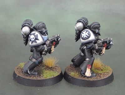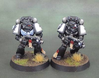The other four members of this squad – and four of the other five on the painting desk – are essentially more “rescue marines”. Bought from (I think) eBay any number of years ago, assembled and with a spattering of mostly-black paint on them but not especially cleaned up, they sat for years until earlier this year when the impending release of 8th made me look through the various bits boxes and random junk I’d accumulated for 40k figures that deserved a resurrection.