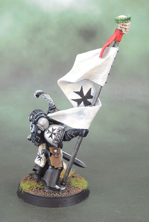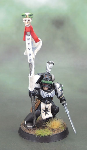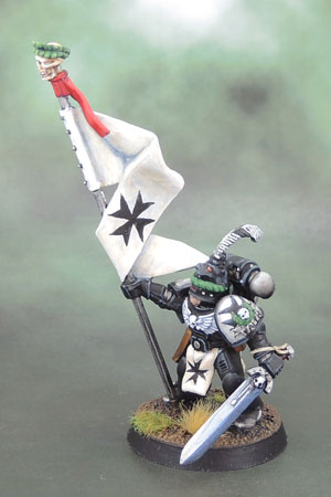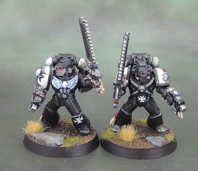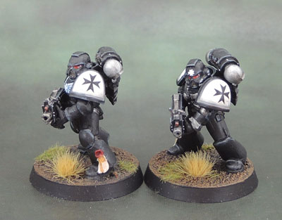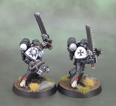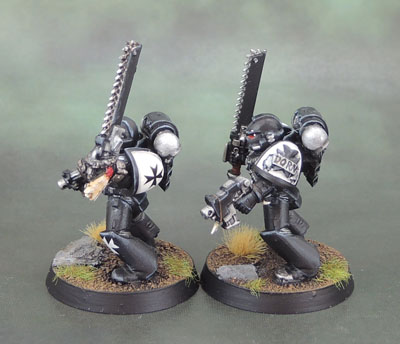 The first of their number is actually the first Black Templars model I ever started painting. Sometime around 3rd edition and Codex: Armageddon, there was not actually a Black Templars sprue available yet. There were, however, separate metal shoulderpads, and so that is what he was outfitted with. The sword is actually a Space Wolf blade, with the wolf-skull cut down to a human shape and size, and the tabard is one of my very early efforts with greenstuff/kneadatite.