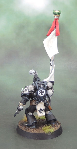 As can probably be guessed, his Sallet-style helm with its Panther crest, and the banner arm originally came from the Empire Knightly Orders kit, which sadly appears to have been a casualty of the Age of Sigmar. It is (was?) a great kit, that not only made some great looking knights, but was a goldmine for kitbashing and conversion, particularly for forces like the Black Templars. One day this guy may be promoted to Chapter Ancient, though more likely he’ll be this squad’s Sword Brother as the banner is cool but not really blinged out enough to be an Astartes Company Banner or equivalent. Maybe I’ll have to hang a bolter from his backpack?