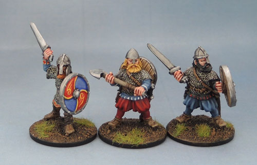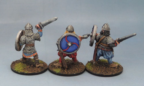 Here are the next trio of “Book Two”s Vikings. As you may have guessed, following the stuff I do en masse, like the chainmail – I tend to paint, and especially complete them in duos and trios based on a similar palette. While it might give these three guys a superficial feeling of being overly red-blue while together, once they’re all mixed in together with the other Viking models, it’s all much more varied.