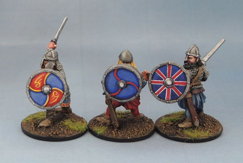 And the shields. The one shield that appears to have a Union Flag design on it wasn’t originally planned to appear that way. The pattern I was copying had much narrower white borders and really didn’t have the appearance of the UK flag, but when you’re hand painting onto a tiny 25mm-scale shield, getting those white lines thinner while still remaining distinct is a little difficult. Having completed it, it took enough effort for me to give it the old “ah well, it was tricky enough to do and it looks decent, so it stays!”