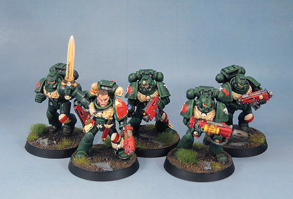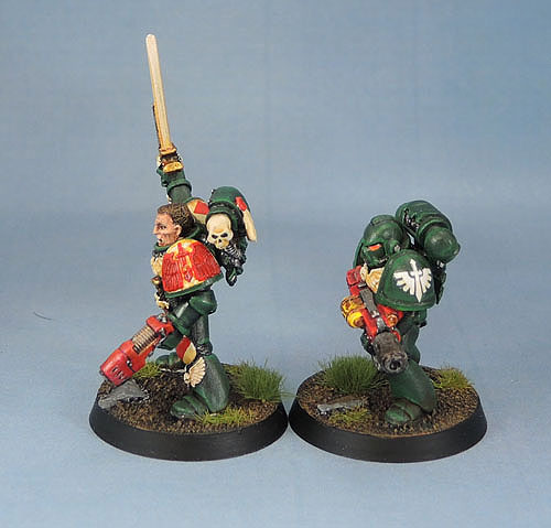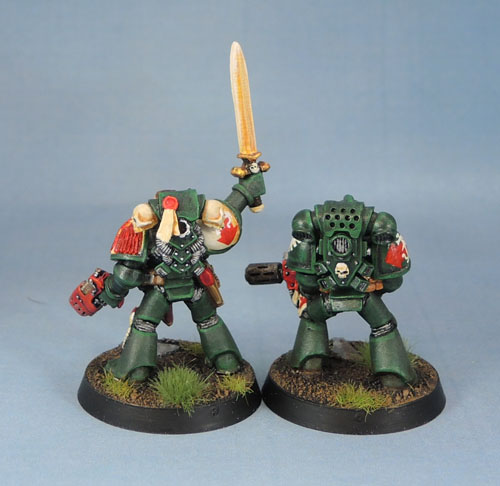 I also had a whole bunch of metal marine shoulderpads. I thought the Deathwing pad looked rather spiffy, though where to use them? The solution was to consider Veteran Sergeants (which were an upgrade option at the time) to be “Deathwing Initiates”. The background speaks of circles within circles amongst the Dark Angels, so I felt that the promotion to Veteran Sergeant justified that extra little bit of fluff – and bling. Hence the bone-coloured pauldrons and red Deathwing Chapter badge. Bone-coloured power sword? Why not!