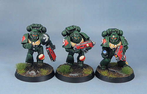 This trip of Tactical marines were built with the notion of being part of the Sergeant’s Combat Squad. I used 3rd ed Assault Squad legs to give them some movement, given that the Sergeant is armed for Close assault and his offsider carries a close-ranged Melta-Gun.