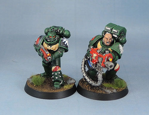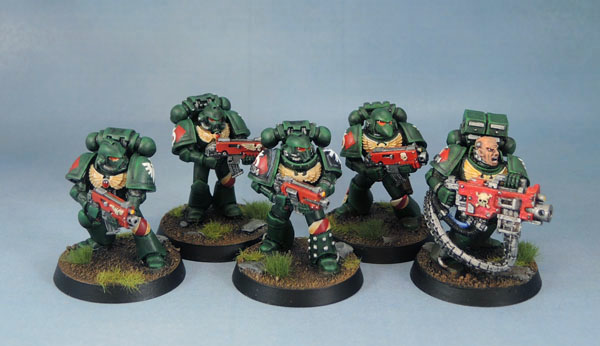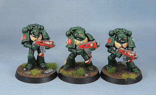 These three marines include the other pair of models added to the squad. The central model is one of the originals. The two flanking him here are 2nd edition Tactical marines. Since the rest of the squad is old-school and minimally-blinged, what better models to use in it than 2e Tactical marines. I have given them more modern arms and bolters – because frankly outside of a specific use, the chunky arms and bolters from those days just don’t work for me these days and those older base models look just fine with them.