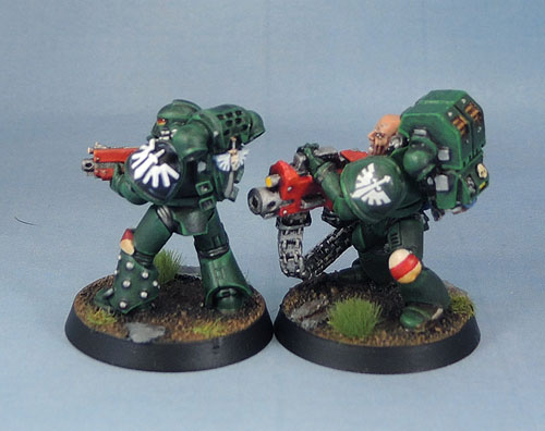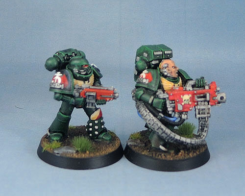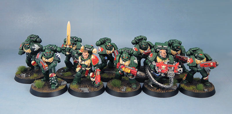 Here we have the newly-raised second 2 Section of 3rd Squad. Having previously been a seven-man squad, it necessitated the addition of three more models to being the unit up to legal 8th Edition. The first of these is the Corporal. I know that officially Corporals aren’t a thing in 40k, but then, Lieutenants were missing for 20-odd years before magically reappearing a month or so ago! The Corporals in my marine forces are the guys who run the other combat squads – usually the fire support bit. I’m giving the Dark Angels Corporals a metal should pad with a simple, embossed chapter badge, and black pauldrons.