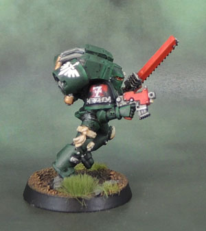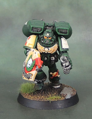 The Squad Corporal is one of the two models I built and painted recently. In game terms he’s identical to the troopers in the rest of the unit. In the event that I (or anyone else playing them) decides to split the 10-man Squad into 5-man Combat Squads, he’ll be the one to lead them. No functional difference of course, but the model follows the lore – which is how I like to do things. He’s built from a mix of plastic Marine Vanguard and Assault parts with a metal DA shoulder pad and a Templar “knight” style head.