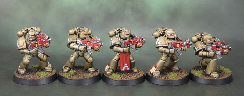 Taking a brief diversion from Dark Angels (still need to finish their Tac Sergeant – hopefully later today!) – but instead I have the Bolter half of a Devastator Squad for the Minotaurs. Once again, with luck I’ll finish the heavy half of the squad later today, but with poor weather for spraying in general, work tomorrow and so forth, it’ll likely be a few days at best until I can get them photographed and posted up.
