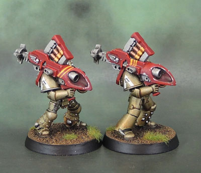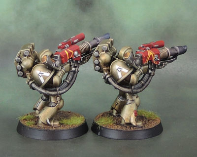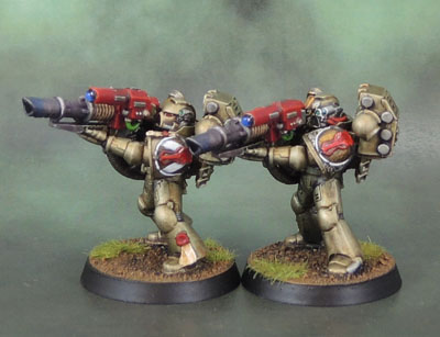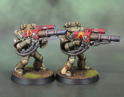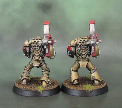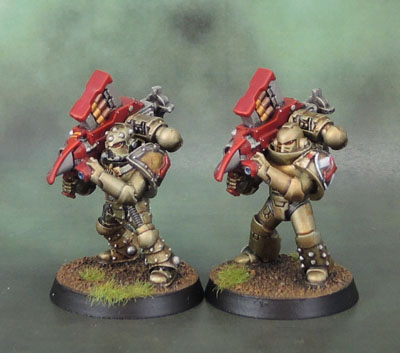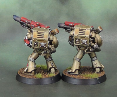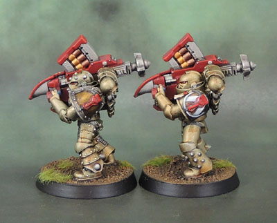 The two Lascannon operators both wear pretty standard MKVII armour. I retained much of the work on the weapons, adding the red weapon casings and putting in the brass of the barrel coils. I might have repainted the barrel tip casings, but I wanted to keep the great heat-discoloured metal that Damo had done, so I left them as-is.