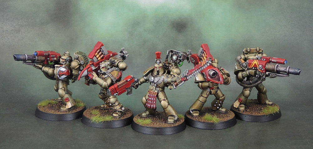 I’ve finally managed to get time to spray, base and photograph the second half of my Minotaurs Devastator Squad. Like most of my Minotaurs units, there’s a bit of kitbashing going on to keep the models interesting.