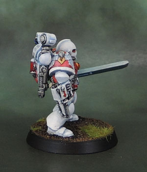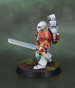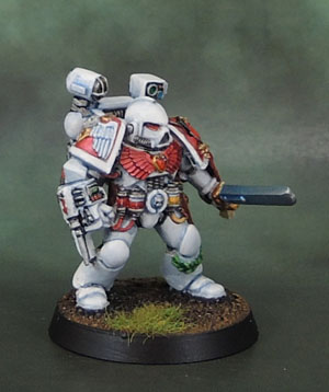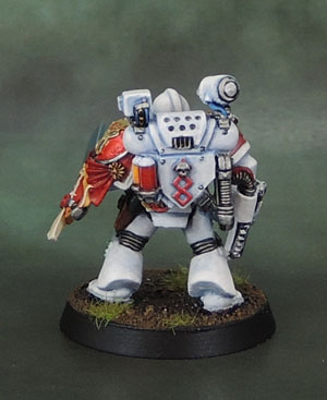 The model itself is an Apothecary circa 1995 or so, with a metal arm with power sword from the 3rd edition Death Company box from 1999 pinned on. Not the first of the contents of that box that have popped up in my other units… The shoulder pad is a Forge World Minotaurs pad with a cloth draped down the arm, which looks good on one hand, but obscures a bit more detail than I’d like on the other hand.