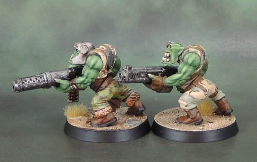 The two Lascannon operators both wear pretty standard MKVII armour. I retained much of the work on the weapons, adding the red weapon casings and putting in the brass of the barrel coils. I might have repainted the barrel tip casings, but I wanted to keep the great heat-discoloured metal that Damo had done, so I left them as-is.