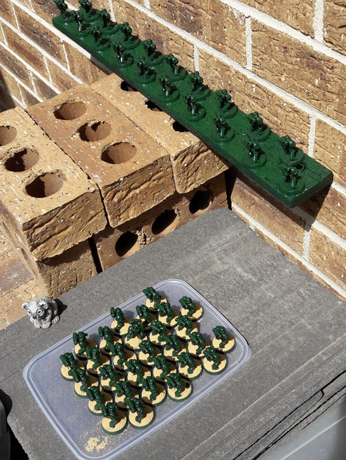• They all now have sand applied to the bases, so they’re ticking along. Very little paint time tomorrow, so if I’m lucky I’ll get to paint the sand black. I wouldn’t expect much (or any) more than that. Maybe drybrush the bases on Thursday? But… there’s more than 50 of them, so even simple stuff like that takes a fair whack of time. Once I get to the “proper” painting I’ll probably do them in batches of about 5 to retain my sanity. 😉